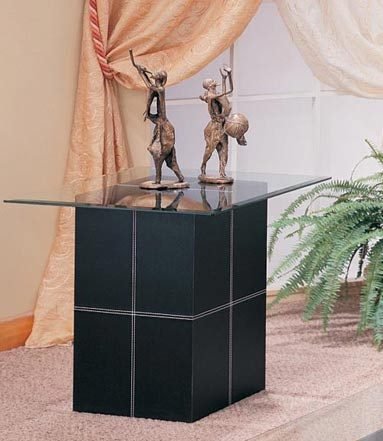 This bold contemporary end table will add a sophisticated flair to your living room. The table features a square pedestal base covered in rich black bonded leather with white accent stitching. The sleek square beveled glass top sits above, for a regal but modern look. Add your own lamp and favorite decorative items to this table, and place next to a chair or sofa for a complete living room ensemble. The Williams collection will help you create a bold one-of-a-kind style in your contemporary living room. These stunning occasional tables have daring bases, covered in luxurious black bonded leather and accented with white stitching. The structural look of the bases are balanced with sleek and sophisticated beveled glass tops, for a bright modern look that you will love. Add these pieces to your home for an instant update to your contemporary living room ensemble. Features: Bonded Leather Finish White stitching Glass top Specifications: 24"W x 24"D 25"H