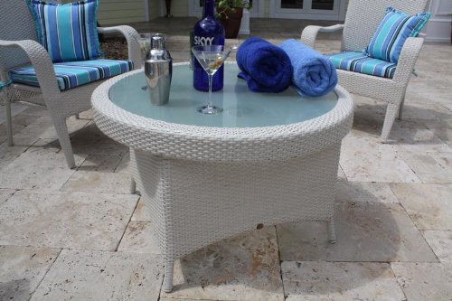 The Grenada Patio Round Coffee Table has a fully anodized aluminum frame and woven Viro fiber, which gives this table a unique textured surface. The collection also features frosted tempered glass on all its tables.Height 22Assembly Required No Assembly RequiredWidth 36Aluminum Frame with All-Weather Viro Fiber WickerFinish White